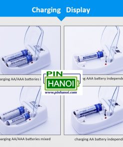 Pin tiểu AA dung lượng 1200mAh sạc đầy trong vòng 7h-8h. Đèn hiển thị sẽ vẫn sáng khi sạc đầy, nhưng bộ sạc sẽ tự cân chỉnh không cho dòng điện vào pin để giữ tuổi thọ pin lâu dài mà không bị chai pin.