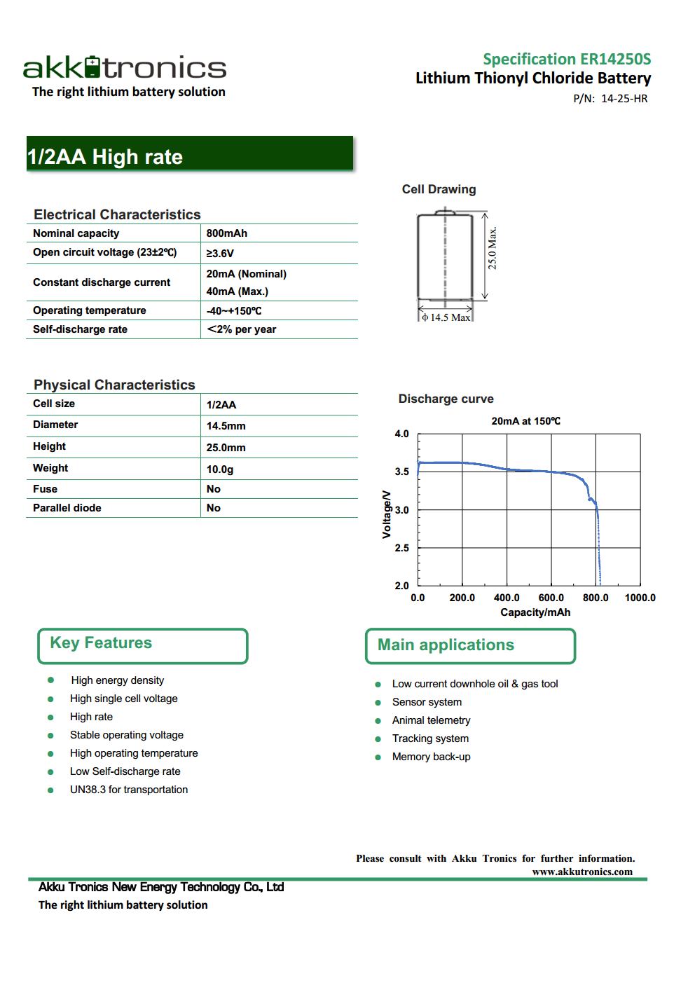 Pin chịu nhiệt 150 độ C AKKUTRONICS ER14250S 3.6V ER14250MR-145