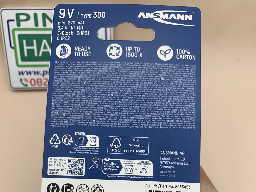 Nhằm tiết kiệm chi phí và thay thế cho những loại pin 9V (E-block) chỉ sử dụng một lần, ANSMANN AG (GERMANY) đã cho ra đời loại pin sạc Ansmann E-block 300mAh dung lượng lên đến 300mAh cho thời gian sử dụng lâu hơn. Pin có tuổi thọ cao, thời gian chờ kéo dài và bạn có thể nạp năng lượng cho pin bằng sạc của Ansmann hoặc các bộ sạc tương thích khác. Pin sử dụng được cho micro, đồ chơi trẻ em và các đồ điện tử dùng pin 9V. Pin sạc Ansmann E-block 300mAh chính là lựa chọn phù hợp dành cho bạn