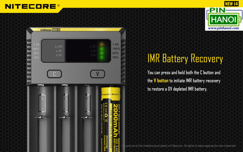 - i4 Intellicharger V2Hỗ trợ pin Li-ion : 26650, 22650, 18650, 17670, 18490, 17500, 17335, 16340 (RCR), 14500, 10440