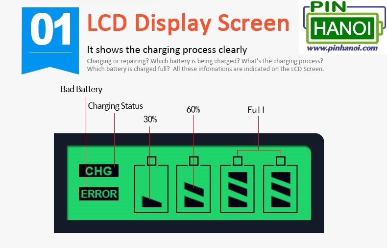 - Nếu pin lỗi hoặc quá trình sạc phát hiện Pin lỗi, màn hình sẽ nhấp nháy và quá trình sạc ngừng lại