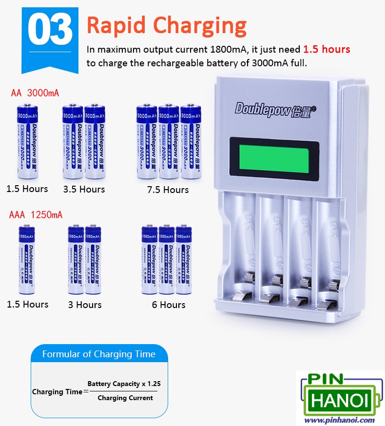 - Thời gian sạc 2.4h với pin AA-1000mAh; dòng sạc 500mAh cho cả AA và AAA