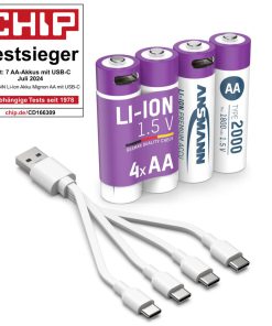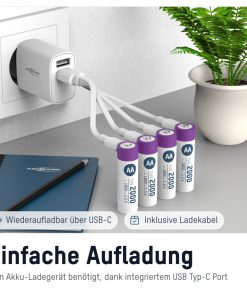 Qua cổng sạc USB Type-C tích hợp, không cần thêm bộ sạc nào nữa! Cáp USB-C phù hợp đã bao gồm trong gói hàng. Điều này cho phép sạc 4 pin AA cùng lúc chỉ bằng một cáp. Điều này có nghĩa là chúng tôi có thể đảm bảo sạc an toàn và dễ dàng thông qua tất cả các tùy chọn sạc USB có sẵn như máy tính xách tay, sạc dự phòng, bộ sạc USB cho ổ cắm hoặc ô tô hoặc bộ sạc USB tích hợp trên tường hoặc trong ô tô.